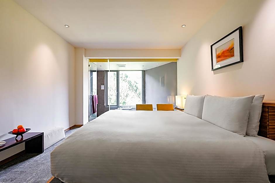 Featuring soft, elegant decor, the room includes a large private 2-seater hotspring tub made of Guanyin rock and floor-to-ceiling windows overlooking Shamao Mountain.